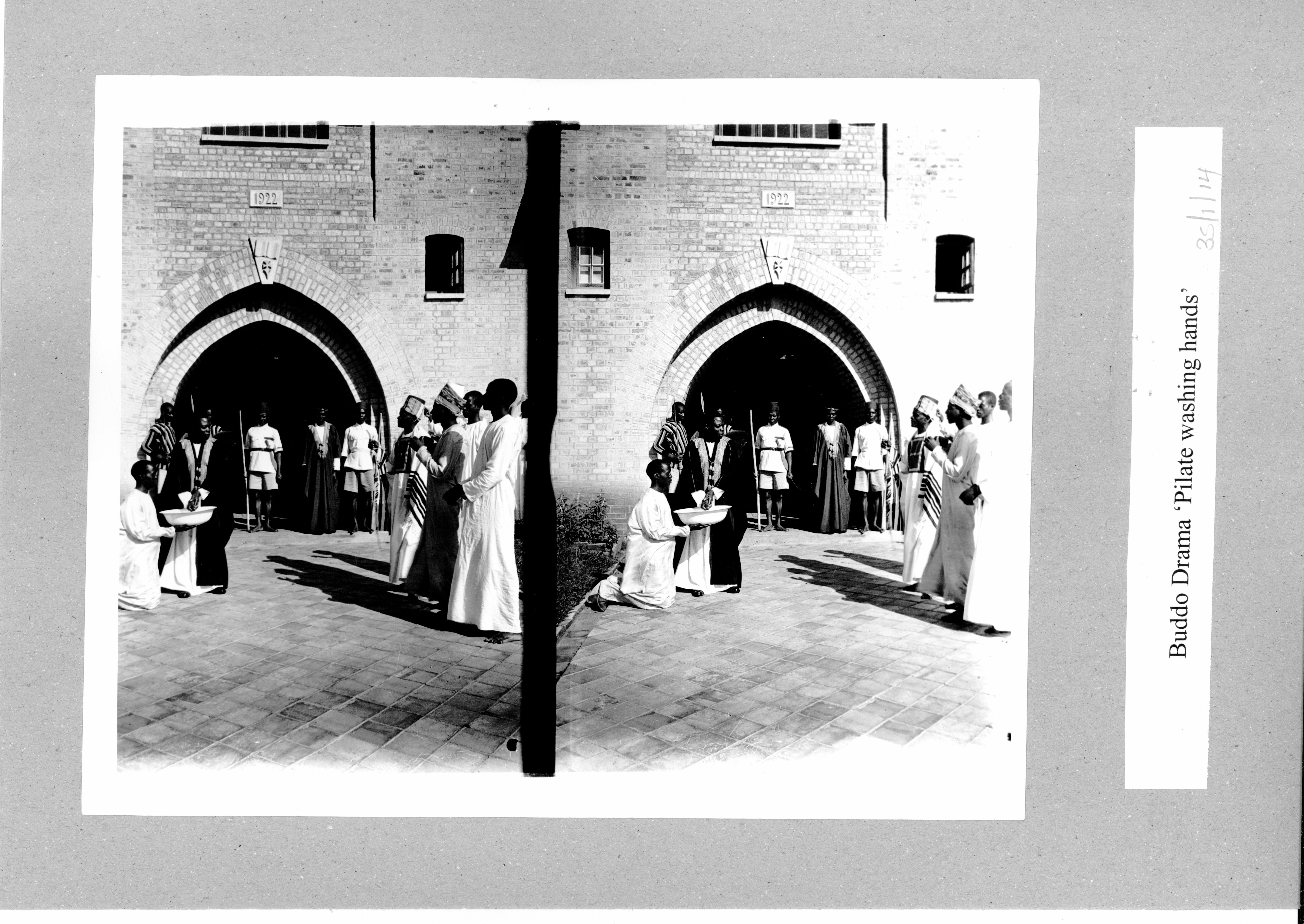 The photograph shows Buddo pupils participating in a drama titled "pilate washing hands"